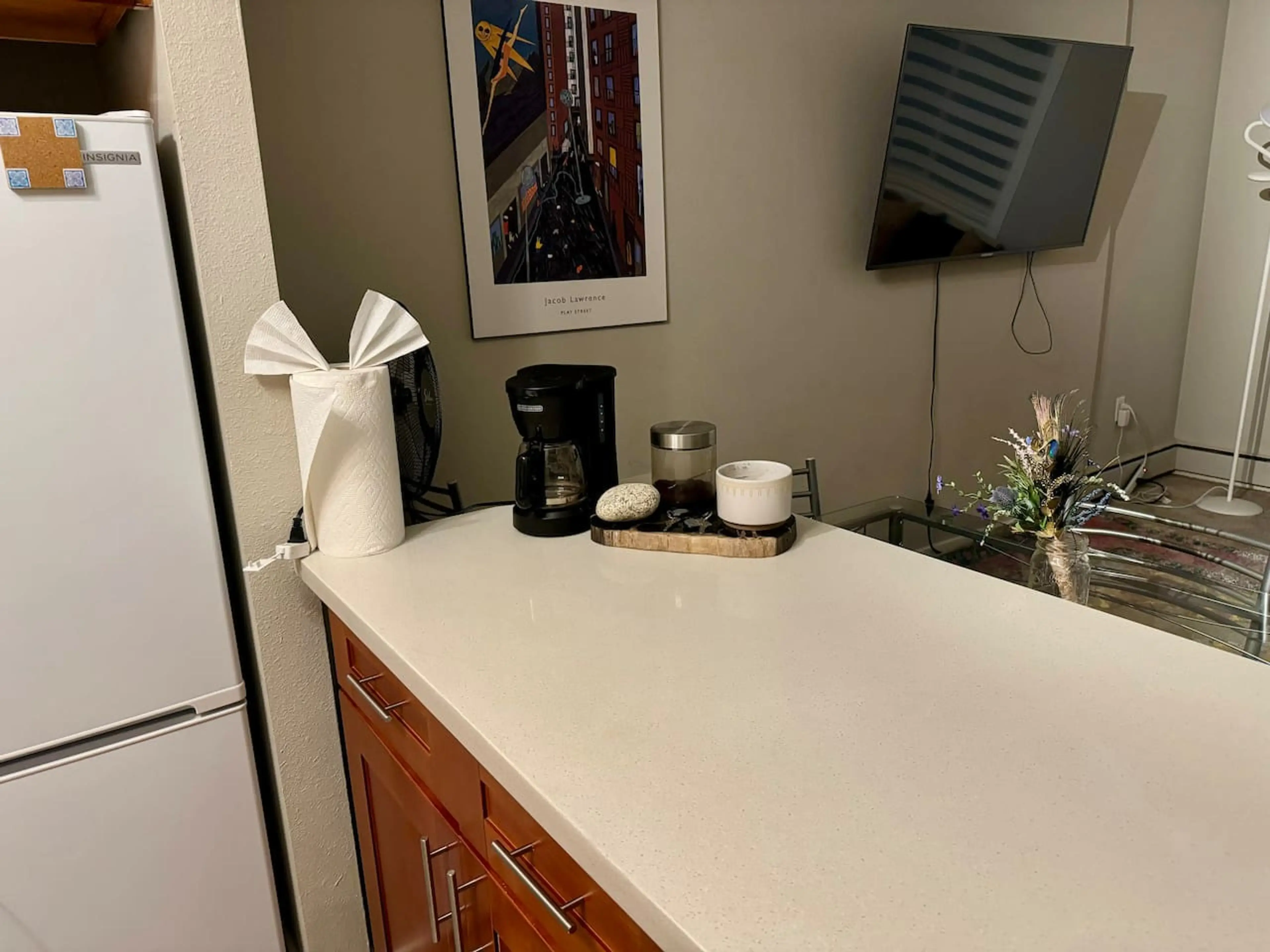 Check-in process and general communication with the manager were easy and very good. Building is in a safe and central location. Rooftop was fun at night to see an aerial view of the city.Unit itself is a modern but small starter apartment lacking in storage/counter space in the bathroom. Probably great for two people, rather tight for four people.